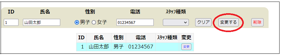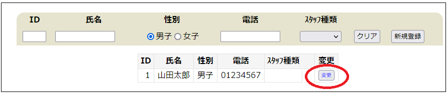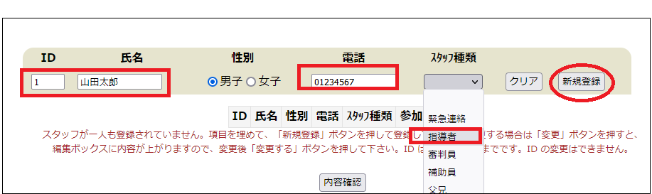 2. ID(※1~99までの連番)、氏名、性別、電話を入力、スタッフ種類をプルダウンで選択後、「新規登録」ボタンを押す。