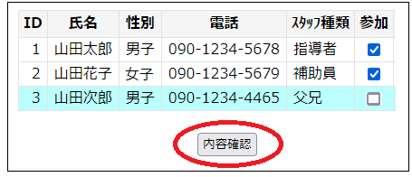 2 登録済みの全スタッフとチェックボックスが現れるので、参加する場合は✓を入れ、不参加の場合は外し、設定が完了したら、「内容確認」ボタンを押す。